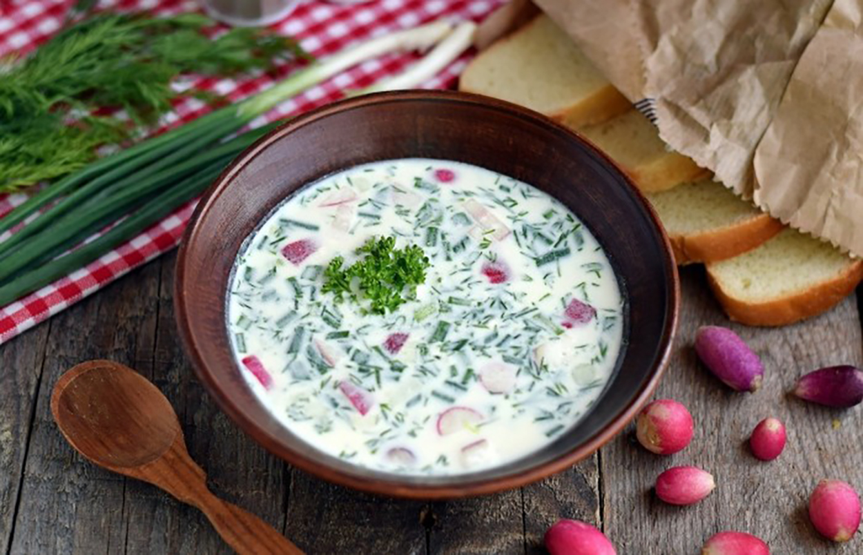 Курица отварная, картофель, огурцы свежие, яйцо, лук, зелень, квас, сметана