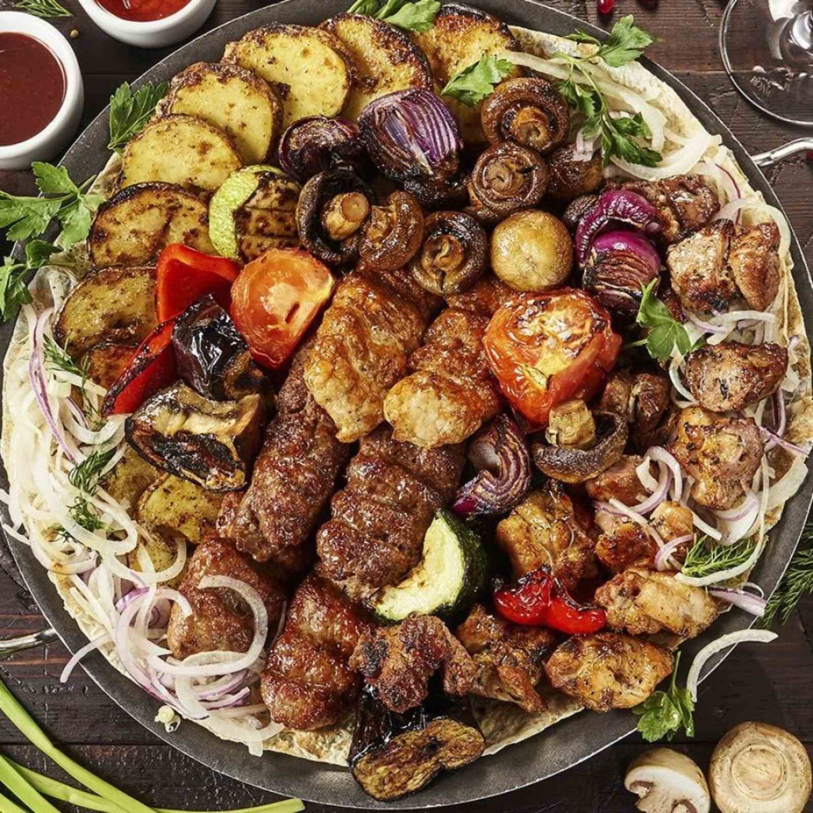 1 кг свиной шеи, соус, лук, лаваш, картошка с копченым салом 500 гр, грибы 400 гр